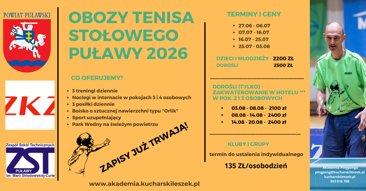 Od 22 lat organizujemy obozy tenisa stołowego. W tym roku już po raz drugi spotkamy się w Puławach. Zeszłoroczne obozy były bardzo udane i cieszyły się dużym zainteresowaniem, dlatego wracamy w to samo miejsce.